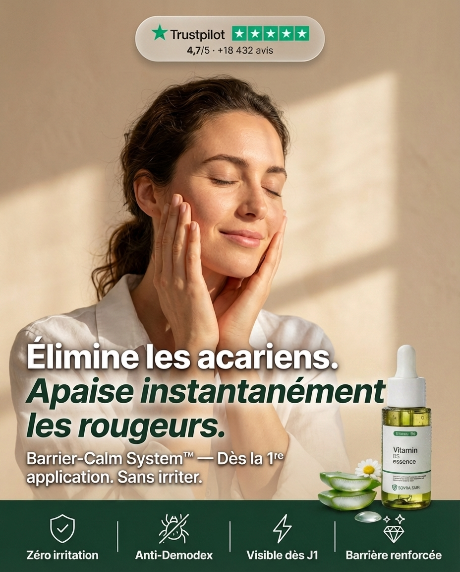 Les Demodex sont des micro-acariens naturellement présents sur la peau de tout le monde. En temps normal, ils sont inoffensifs. Mais quand la barrière cutanée est fragilisée — par le stress, les routines trop agressives, l'environnement — leur population peut exploser. Ils se reproduisent la nuit et déclenchent une cascade inflammatoire : rougeurs persistantes, flush, papules, sensibilité accrue. C'est un phénomène bien documenté en dermatologie, notamment dans les cas de rosacée.