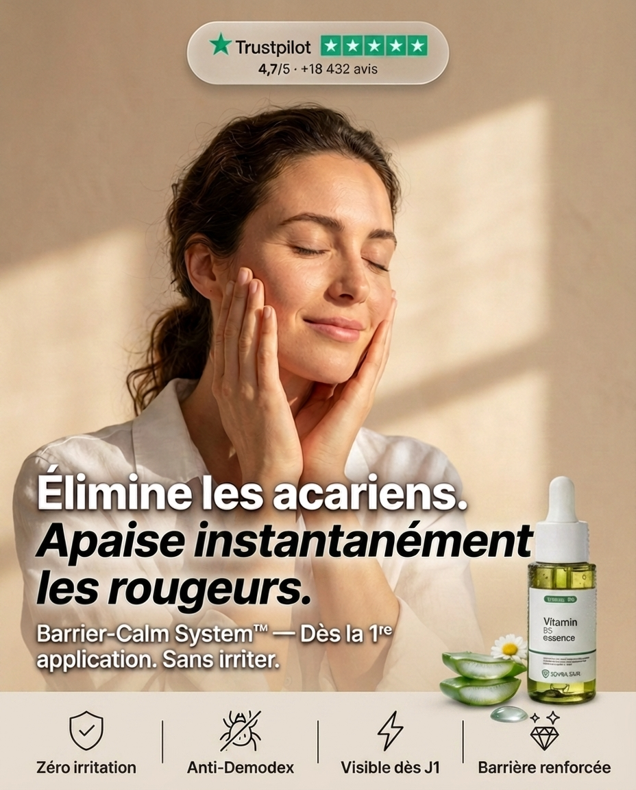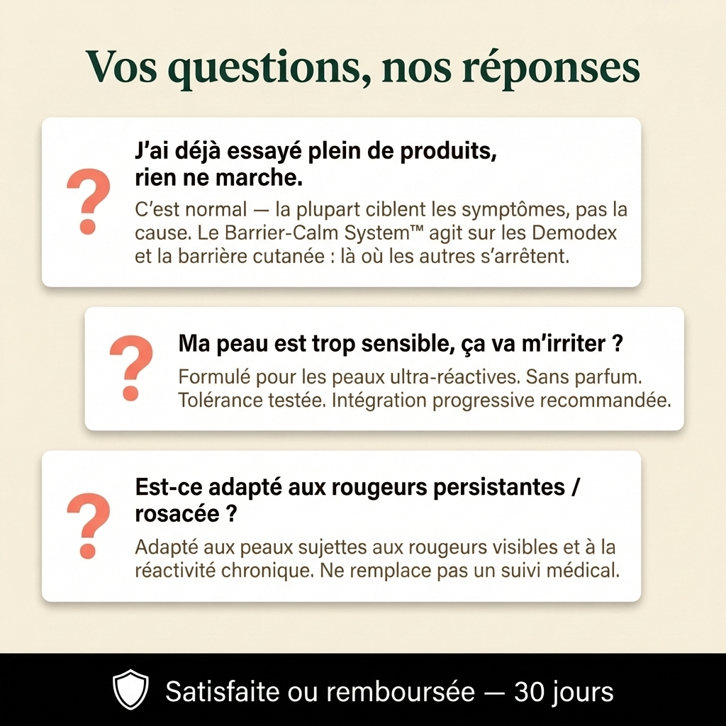 C'est un sérum concentré de 30 ml formulé pour les peaux sujettes aux rougeurs visibles et à la réactivité cutanée. Contrairement aux sérums classiques qui se contentent de masquer les rougeurs, le Barrier-Calm System™ agit sur la cause souvent ignorée de ces rougeurs : les acariens Demodex. Il apaise l'inconfort visible, renforce la barrière cutanée fragilisée et aide la peau à devenir moins réactive au quotidien.