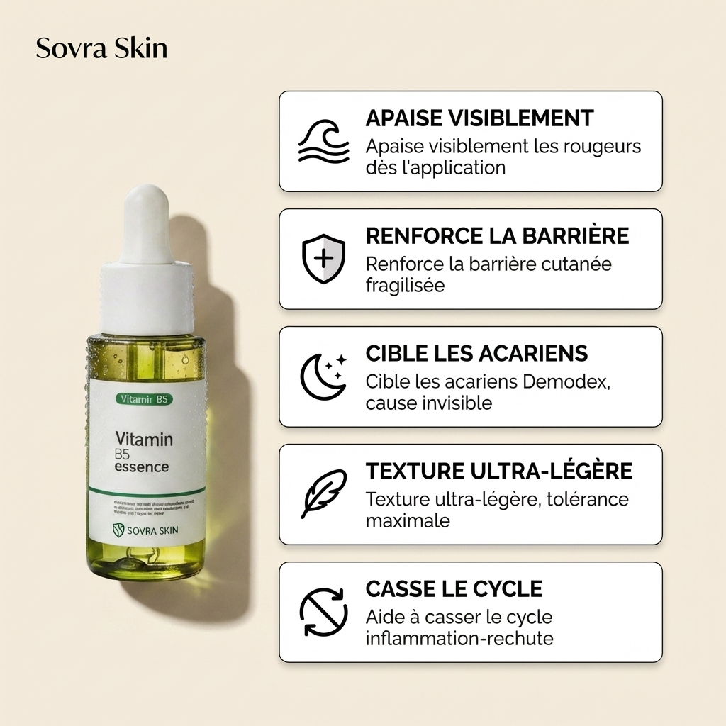 Le sérum Sovra Skin est formulé pour les peaux sujettes aux rougeurs visibles, à la réactivité cutanée et aux déclencheurs inflammatoires — ce qui inclut les symptômes typiques de la rosacée. Les Demodex sont d'ailleurs un facteur reconnu en dermatologie dans de nombreux cas de rosacée.